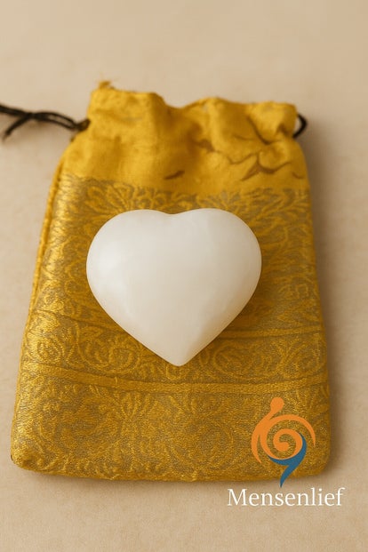 Dit hart is geslepen uit witte seleniet – een bijzondere, vezelige steensoort met een zachte, zijdeachtige glans. Seleniet is vernoemd naar Selene, de Griekse godin van de maan, en werd in de oudheid al gebruikt als symbool voor zuiverheid, licht en vrouwelijke wijsheid.